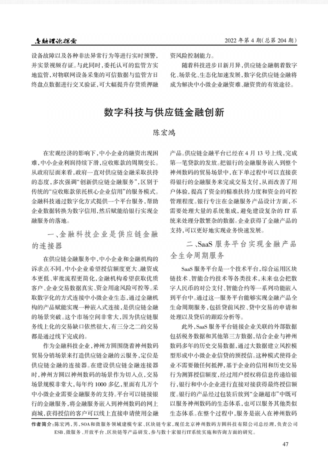 神州信息撰写的《数字科技与供应链金融创新》于2022年第4期刊载。