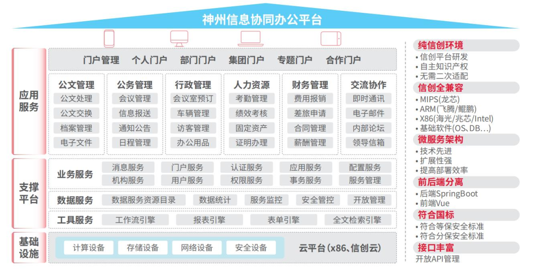 神州信息协同办公平台是基于微服务应用架构设计的一体化办公平台,该平台采用前后端分离的开发模式,支持在龙芯、鲲鹏、飞腾、兆芯等芯片的国产服务器安装部署,能够为企业提供丰富的协同功能应用,满足客户多样化、场景化、个性化的应用需求,助力中大型与集团企业客户实现数字化转型升级。