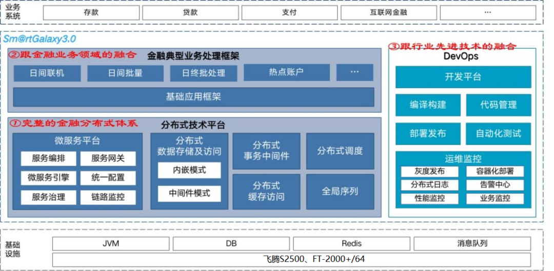 其中神州信息金融级分布式核心业务系统,以自主研发的分布式应用平台Sm@rtGalaxy为基础,基于SOA、分布式与微服务的架构规范,采用独立于中间件、数据库平台的开放式架构设计,全面实现与飞腾平台、操作系统、数据库等的开放性兼容。
